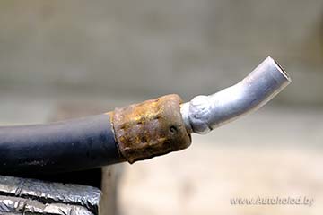 Общее правило здесь такое - если кондиционерный шланг крепится к железным трубкам, то пережимать его нужно железными стаканами. Если же трубки алюминиевые, то стаканы тоже должны быть алюминиевыми. Несоблюдение этого правила ведет к быстрой коррозии в местах соприкосновения инородных металлов (гальваническая пара). Отремонтированный таким образом рукав, как правило, ездит не более года-двух. На фото пример неправильного ремонта - алюминиевая трубка обжата стальным стаканом, что неизбежно приведет к коррозии в местах соприкосновения.