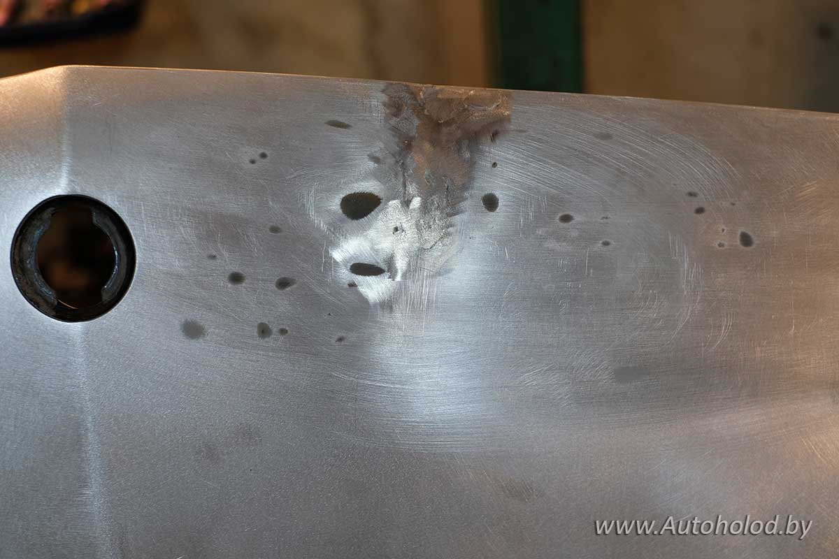 Кроме этого зачастую появляется еще одна трудность, когда заказчик просит заварить капот так, чтобы его не нужно было потом шпаклевать, т.е. чтобы роль шпаклевки выполнял сам сварной материал. При таких заказах приходится делать многократные заварки со шлифовкой. Это сложная и кропотливая работа, но иногда она того стоит, ведь шпаклевка во время эксплуатации может отслоиться, а сварной шов – никогда. Оговорим сразу, что выполнить сварку «под ноль» можно далеко не всегда и все зависит от характера дефекта и наличия времени. Заварка крыльев по большому счету происходит по принципам заварки капотов, за той лишь разницей, что ее часто приходится делать непосредственно на автомобиле и из-за особенностей конструкции крылья в меньшей степени подвержены температурной деформации. Остальное все тоже самое